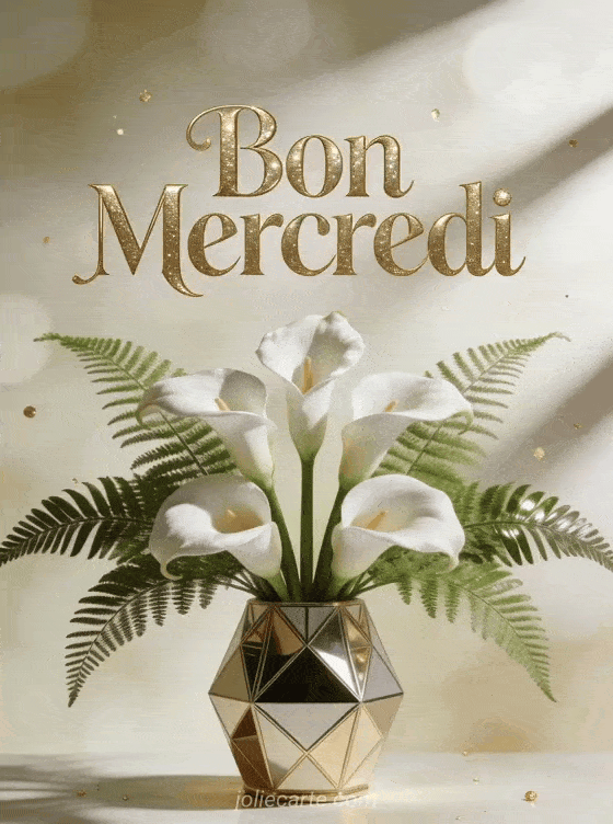 Envoyez cette image « Bon Mercredi » avec de magnifiques arums blancs dans un vase art déco pour une attention raffinée. Complétez avec un mercredi entre amis, un bonjour animé ou un mercredi entre copines.