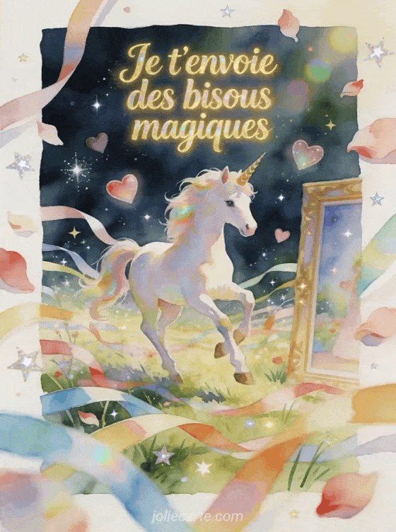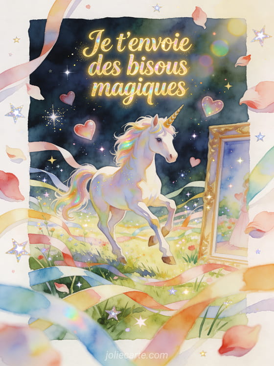 Licorne qui fait des bisous apporte une note féerique et tendre à votre message, parfaite pour émerveiller tout en restant affectueux. Pour prolonger cette magie, associez un petit bisou pour toi, des bisous scintillants ou une carte virtuelle de bisous à votre envoi.