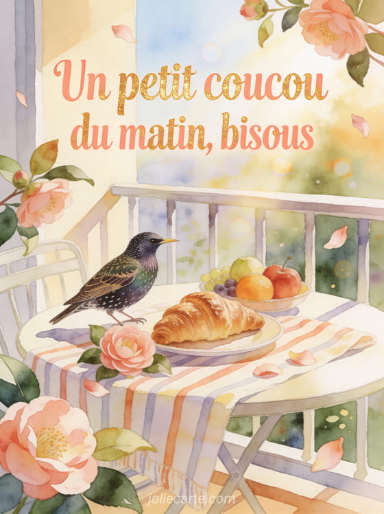 Matin un petit coucou bisous résume une attention simple qui réchauffe dÚs le réveil. Cette carte s'accorde avec un bonjour illustré plein de douceur, prolonge une marque d'affection délicate et transforme un coucou virtuel à partager en vrai sourire.