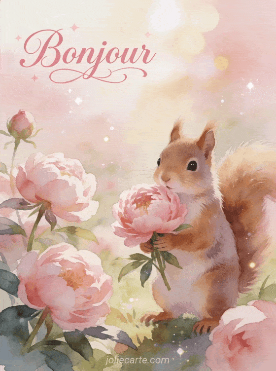 Exprimez votre affection avec ce message de bonjour touchant. Un adorable écureuil tient une pivoine rose dans un jardin matinal. Découvrez aussi un bonjour animé, un bonjour pour maman ou un bonjour respectueux.