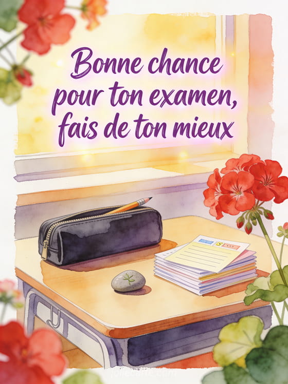 Un message de bonne chance pour examen doit soutenir la confiance sans mettre de pression; cette carte rejoint un encouragement de nouveau dĂ©part, un au revoir positif et une rĂ©ussite professionnelle Ă souhaiter dans un mĂȘme esprit d'Ă©lan.