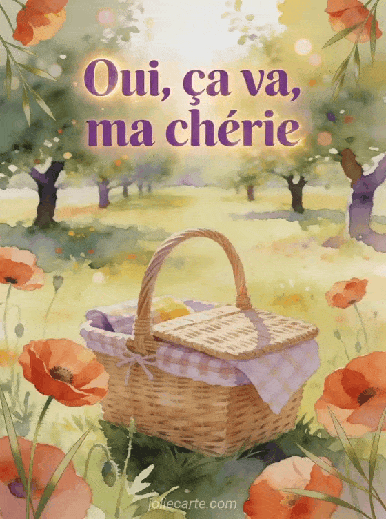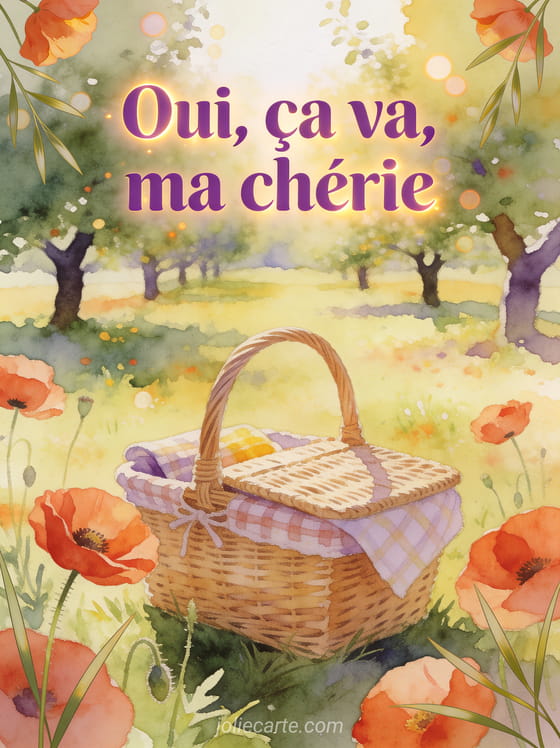 Oui ça va ma chérie répond avec douceur quand on veut rassurer sans longs discours. Cette carte fait écho à un coucou inquiet et tendre, prolonge un bonjour qui espère le meilleur et rejoint une attention fleurie pour demander des nouvelles.