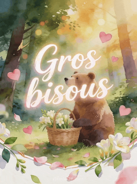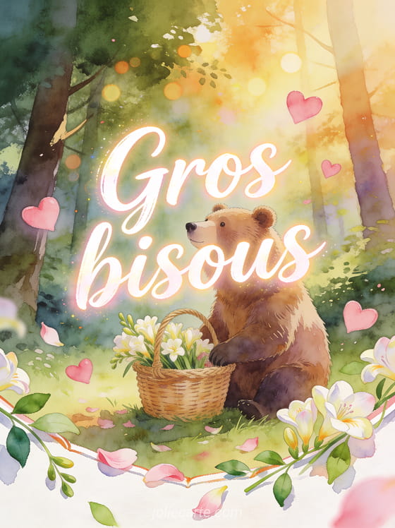 Ours bisous donne un ton tendre et rassurant a ton message, surtout si tu veux l'appuyer avec un vrai message de bisous, l'ouvrir vers des bisous qui s'envolent au ciel ou l'adoucir avec des gifs de bisous autour d'un cafe pour garder une belle chaleur.