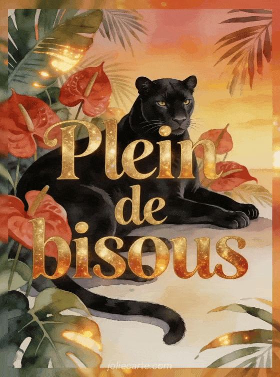 PanthĂšre bisous donne Ă votre message une prĂ©sence intense et originale, tout en gardant une vraie tendresse. Pour enrichir cette intention, ajoutez une tempĂȘte de bisous, une carte de bisous Ă partager ou une image gif de bisous gratuite Ă votre sĂ©lection.