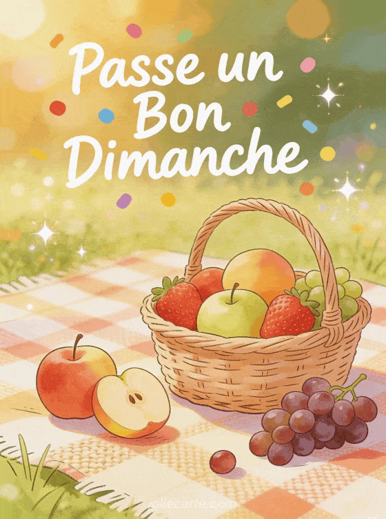 Souhaitez un joyeux dimanche avec cette carte passe un bon dimanche montrant un panier de pique-nique garni de fruits frais sur une prairie ensoleillée. Une invitation à profiter du beau temps dominical en plein air. Parfaite pour un dimanche convivial entre amis.