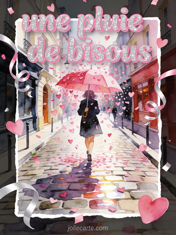 Pluie de bisous fonctionne trÚs bien quand tu veux exagérer la tendresse avec légÚreté, entre un bisou pour dire merci, des bisous virtuels à partager et des bisous sous la pluie pour faire passer une attention vive, souriante et vraiment généreuse.