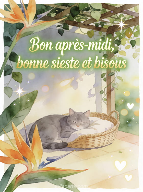 Sieste bisous va à l'essentiel pour souhaiter un repos doux avec une touche d'affection. Cette carte peut suivre les bisous envoyés dans l'après-midi, s'inscrire dans un souhait adressé avec politesse ou changer d'humeur avec une version plus amusante.