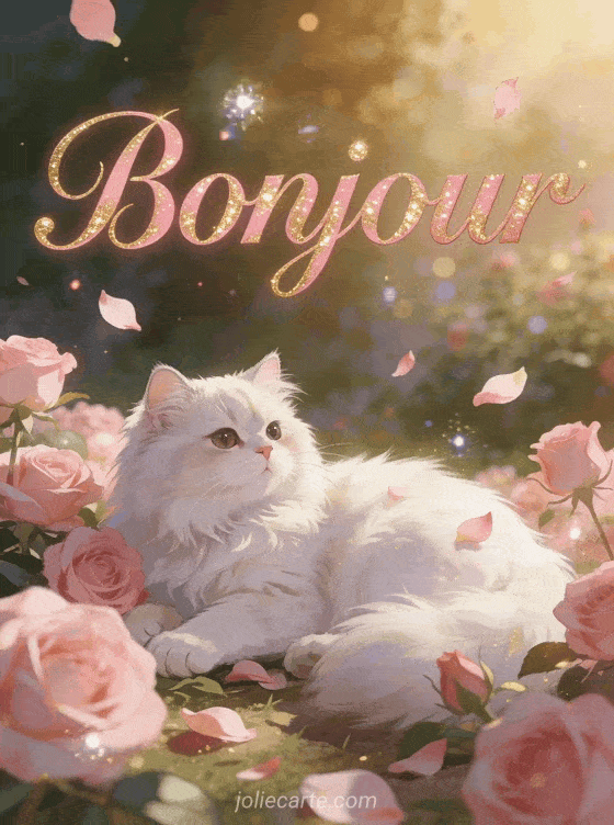 Transmettez vos salutations matinales avec cette image sophistiquĂ©e oĂč un majestueux chat persan blanc se prĂ©lasse parmi des roses aux teintes dĂ©licates. Son regard paisible et son pelage soyeux Ă©voquent le luxe et la douceur parfaits pour cette image de bon mercredi. Partagez cette carte avec ceux qui apprĂ©cient les belles choses et les moments de grĂące, mĂȘme par temps maussade comme cette image de mercredi sous la pluie. L'atmosphĂšre romantique et les pĂ©tales de roses qui flottent ajoutent une touche de poĂ©sie Ă ce message accompagnĂ© d'un gif de bon mercredi.