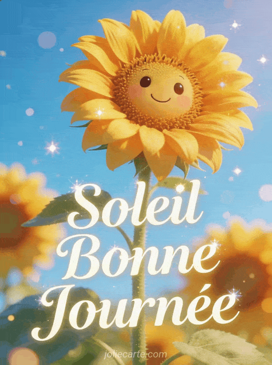 Un magnifique tournesol au coeur souriant rayonne sous un ciel bleu éclatant, entouré de ses compagnons dorés. Cette image vibrante de couleurs et de joie incarne parfaitement l'énergie positive d'une belle journée d'été. Comme le tournesol qui se tourne vers le soleil, gardez le cap sur le positif et profitez de chaque instant de lumiÚre. Découvrez aussi notre carte bonjour mon coeur bonne journée, notre carte bonjour et bonne journée bisous ou notre carte café bonne journée.
