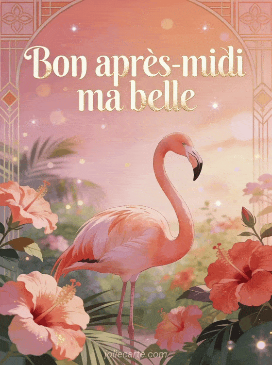 Cette illustration art déco respire l'élégance féminine. Un gracieux flamant rose se tient fièrement parmi des hibiscus en fleurs dans un jardin tropical. Les tons rose et corail créent une atmosphère sophistiquée et raffinée, parfaite pour souhaiter un bon après-midi à une amie chère. Explorez aussi notre carte passer un bon après-midi, notre image bon après-midi mon coeur ou notre carte bon après-midi à tous.