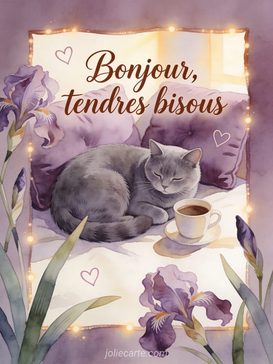 Tendresse bonjour café bisous rassemble une salutation matinale et une attention affectueuse. Cette carte accompagne un café servi avec attention, prolonge un bonjour café pour l'être aimé et illumine un café au soleil du matin.