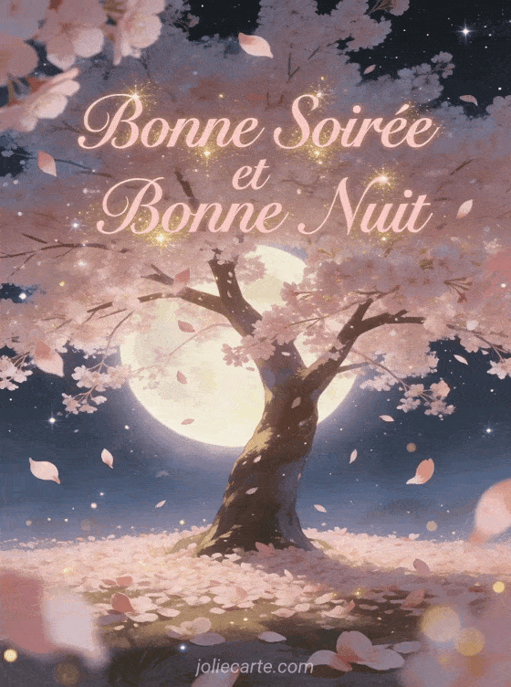 Cette image dĂ©bordante de tendresse prĂ©sente un majestueux cerisier en fleurs baignĂ© par la lumiĂšre de la pleine lune, ses pĂ©tales roses tombant dĂ©licatement comme une neige parfumĂ©e. Le ciel Ă©toilĂ© forme un Ă©crin parfait pour cette scĂšne romantique oĂč chaque dĂ©tail invite Ă la douceur et Ă la sĂ©rĂ©nitĂ© des fins de journĂ©e apaisantes. Partagez aussi une douce nuit Ă©toilĂ©e pour prolonger cette atmosphĂšre tendre. La beautĂ© Ă©phĂ©mĂšre des fleurs de cerisier rappelle la prĂ©ciositĂ© de chaque moment partagĂ© avec ceux que nous aimons, rendant ce message encore plus touchant. Le tapis de pĂ©tales roses au sol ajoute une dimension poĂ©tique Ă cette carte parfaite pour exprimer votre tendresse du soir. Envoyez Ă©galement une belle image nocturne pour varier vos attentions. Cette image est idĂ©ale pour souhaiter une soirĂ©e et une nuit empreintes de douceur Ă quelqu'un de spĂ©cial dans votre vie. Un voeu de beaux rĂȘves complĂ©tera cette tendresse nocturne.