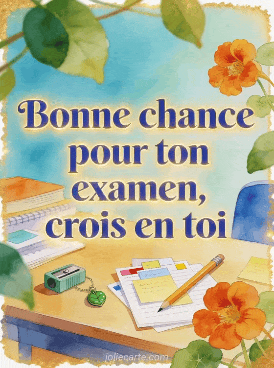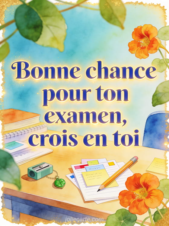 Un texte pour souhaiter bonne chance pour un examen doit rassurer autant qu'encourager; cette carte peut préparer un soutien pour demain, proposer une image gratuite de chance et renforcer un souhait pour ton examen avec confiance.