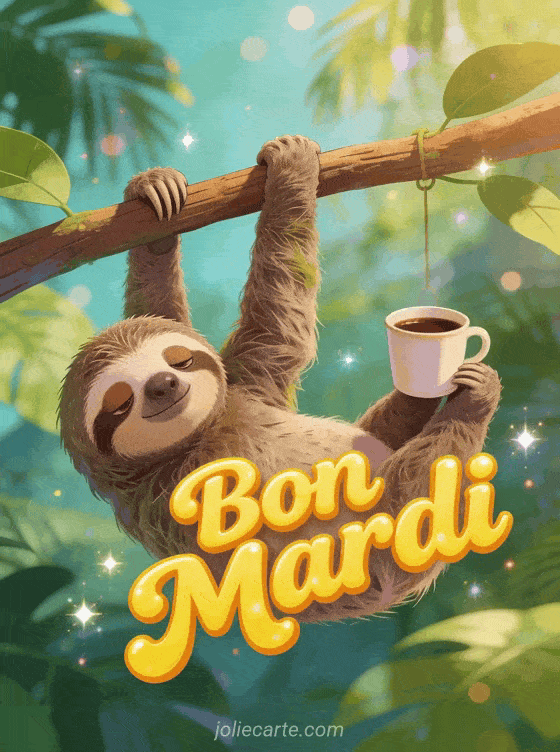 Ce paresseux accrochĂ© Ă sa branche avec son cafĂ© du matin rĂ©sume parfaitement notre envie de rester au lit ce mardi. Son air endormi et sa tasse qui pendouille feront rire tous ceux qui peinent Ă Ă©merger en milieu de semaine. Partagez ce moment de lĂ©gĂšretĂ© avec vos collĂšgues pour une pause fleurie bien mĂ©ritĂ©e dans leur journĂ©e. L'humour de cette scĂšne tropicale rappelle que le mardi peut aussi ĂȘtre pris avec dĂ©contraction et bonne humeur. Offrez Ă©galement une dose de lumiĂšre Ă ceux qui ont besoin d'un sourire.