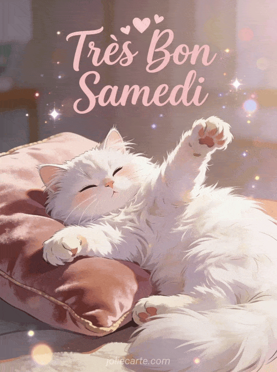 Offrez de la tendresse avec cette carte très bon samedi bisous adorable. L'image montre un chat persan blanc tout doux qui s'étire sur un coussin de velours dans une scène matinale câline. Idéale pour un bon samedi ou un moment de douceur.