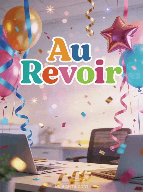 Dites au revoir avec humour grùce à cette carte festive. Ballons et confettis pour célébrer le départ en fanfare ! Voir aussi une carte paisible, une carte road trip ou une carte élégante.