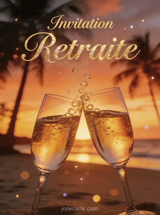 Annoncez votre départ à la retraite avec élégance grùce à cette invitation festive. Un visuel chaleureux avec champagne et coucher de soleil pour donner le ton de la célébration. Partagez cette carte pour convier vos collÚgues à trinquer ensemble.