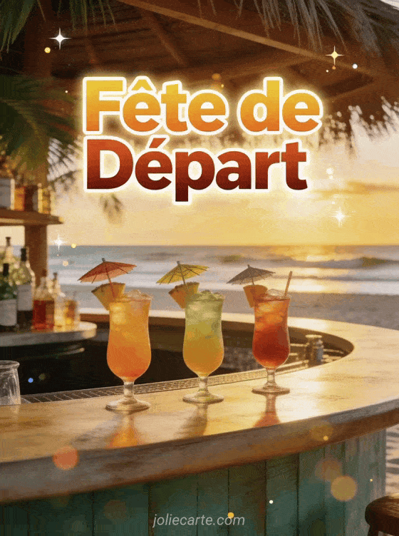 Annoncez votre fĂȘte de dĂ©part avec cette invitation aux couleurs des vacances. Cocktails face Ă l'ocĂ©an : voilĂ ce qui vous attend. Voir aussi une invitation champagne, une carte libertĂ© ou une version humoristique.