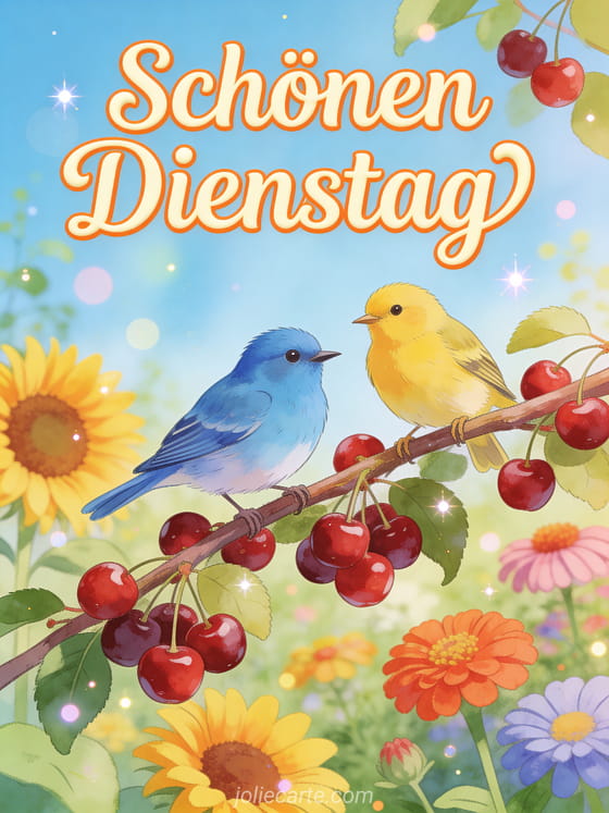 Erhellen Sie jemandem den Dienstag mit dieser lebhaften Grußkarte Schönen Dienstag mit einem Blauvogel und Stieglitz, die Kirschen in einem bunten Sommergarten mit Sonnenblumen teilen.