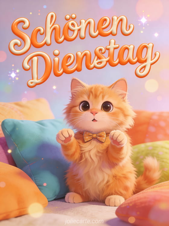 Zaubern Sie jemandem ein Lächeln ins Gesicht mit dieser lustigen Grußkarte Schönen Dienstag mit einer bezaubernden roten Katze mit großen neugierigen Augen und Fliege. Entdecken Sie auch eine Dienstag Welpen Karte oder eine Dienstag Vögel Karte.