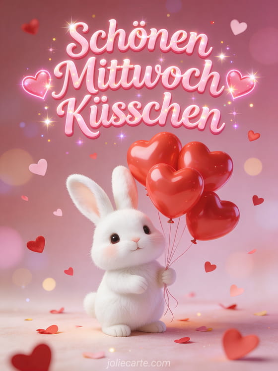 Senden Sie Liebe am Mittwoch mit dieser süßen Grußkarte Schönen Mittwoch Küsschen mit einem niedlichen weißen Häschen umgeben von roten herzförmigen Ballons mit Herzkonfetti. Entdecken Sie auch eine Guten Morgen Mittwoch Karte oder eine Mittwoch Kätzchen Karte.