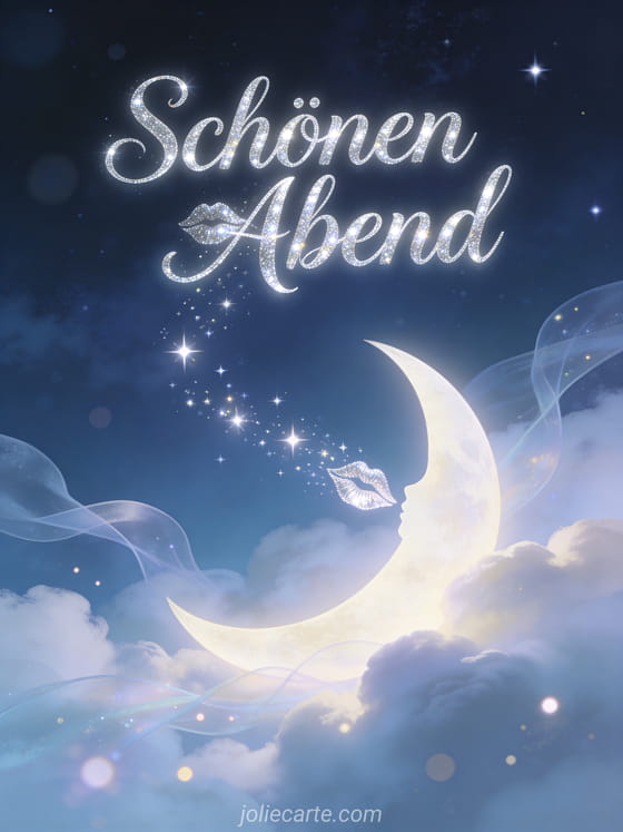 WĂŒnschen Sie einen wunderschönen Abend mit dieser bezaubernden Karte mit einem Halbmond, der Sternenstaub ĂŒber eine Wolkenlandschaft blĂ€st. Entdecken Sie auch eine Abendkarte mit KĂ€tzchen oder eine animierte Abendkarte.