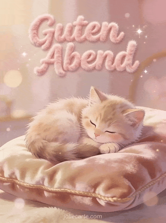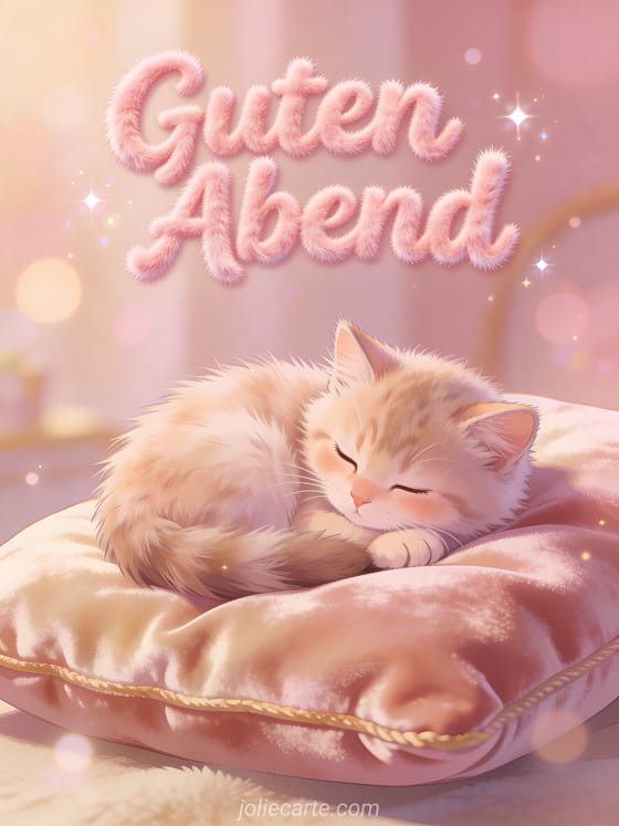Versenden Sie einen süßen Guten-Abend-Gruß mit dieser entzückenden Karte. Ein niedliches flauschiges Kätzchen liegt eingerollt auf einem Samtkissen in einer warmen rosa und cremefarbenen Atmosphäre, perfekt für einen gemütlichen Abendgruß. Entdecken Sie auch eine Segelboot-Abend-Karte oder eine magische Abend-Karte.