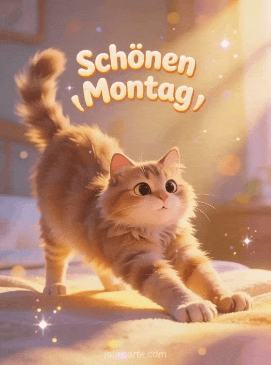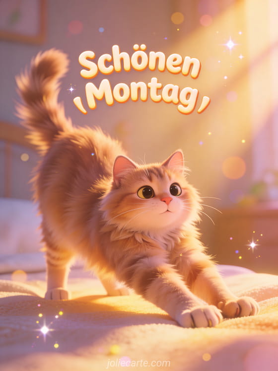 Starten Sie die Woche mit einem Lächeln und versenden Sie diese süße Grußkarte Schönen Montag mit einer niedlichen Katze im Morgensonnenstrahl. Entdecken Sie auch eine Montagsgrüße Karte.