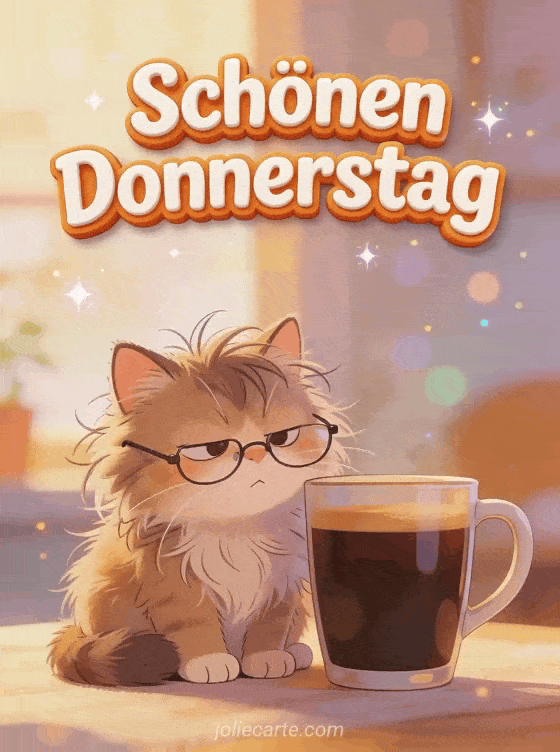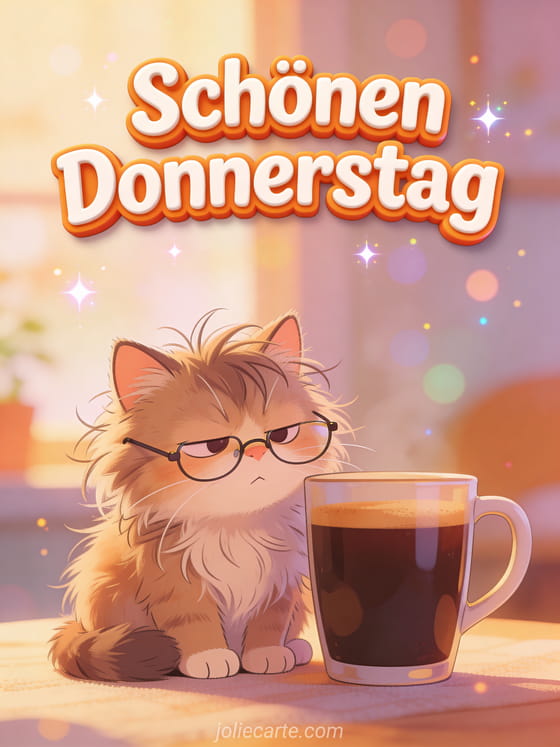 Zaubern Sie am Donnerstag ein LĂ€cheln mit dieser lustigen GruĂkarte Schönen Donnerstag mit einer mĂŒrrischen aber sĂŒĂen Katze mit Lesebrille neben einer riesigen Kaffeetasse. Entdecken Sie auch eine Guten Morgen Donnerstag Karte, eine sonnige Donnerstagskarte oder eine Schönen Donnerstag Karte.