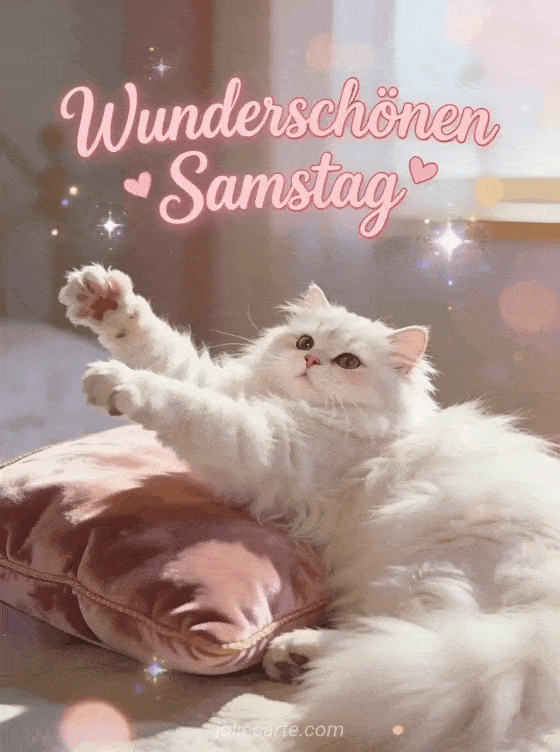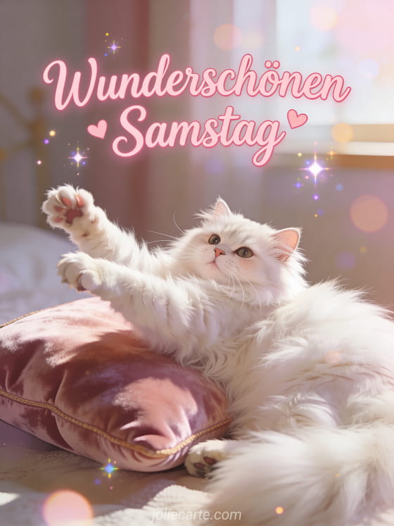 Verschicken Sie einen bezaubernden Samstagsgruß mit dieser liebevollen Karte. Eine flauschige weiße Perserkatze streckt sich auf einem Samtkissen in einer entzückenden Morgenszene. Entdecken Sie auch eine lustige Samstagskarte mit Frosch.