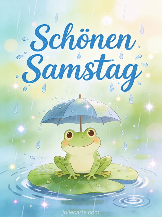 Verschicken Sie einen lustigen Samstagsgruß mit dieser witzigen Karte. Ein fröhlicher Frosch mit einem kleinen Regenschirm auf einem Seerosenblatt an einem komischen Regentag, der Freude und Lachen zum Wochenende bringt.