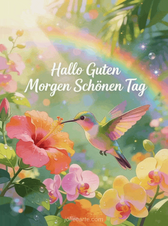 Verschoenere jemandem den Morgen mit diesem lebhaften Hallo-und-guten-Morgen-Gruss. Entdecke auch eine animierte Hallo-Karte, eine Hallo-guten-Tag-Karte mit Kuesschen oder eine Hallo-schoenen-Tag-Karte.