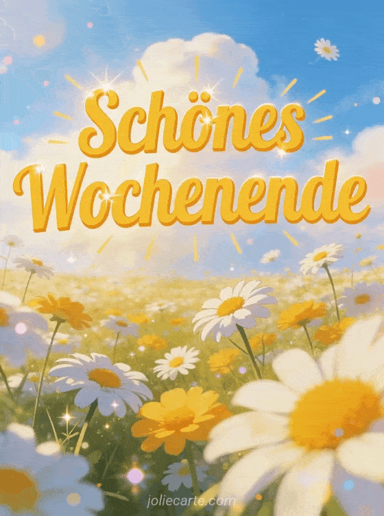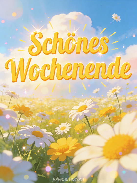 Versenden Sie einen fröhlichen Wochenend-GruĂ, um jemandem den Tag zu verschönern. Eine wunderschöne Sommerwiese voller weiĂer und gelber GĂ€nseblĂŒmchen unter einem blauen Himmel mit SchĂ€fchenwolken im strahlenden Sonnenschein. Entdecken Sie auch eine lustige Wochenend-Karte oder eine Wochenend-Karte mit Garten.