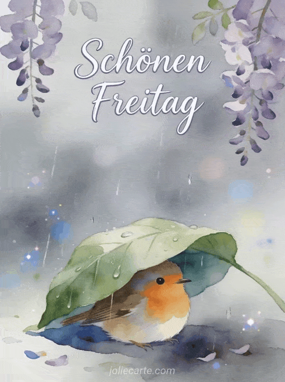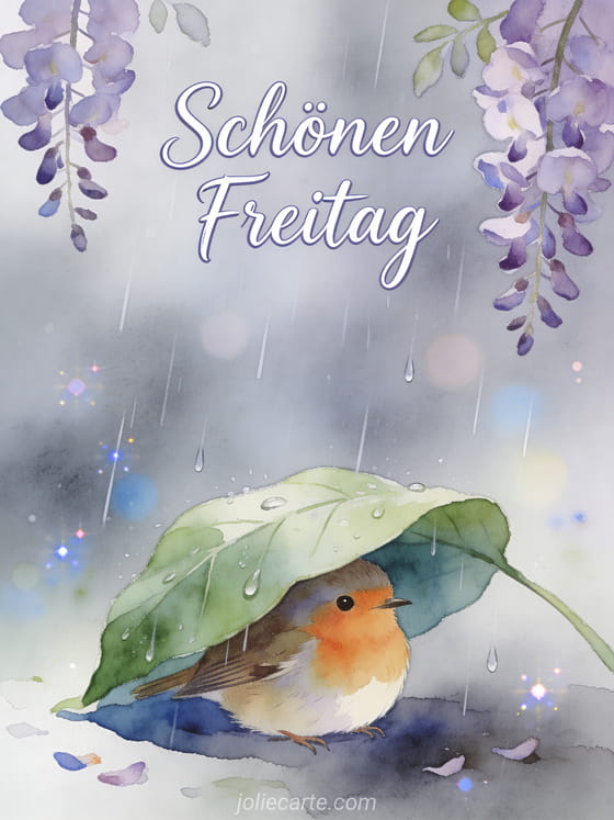 Verschicken Sie einen friedlichen Freitagsgruß mit dieser bezaubernden Karte. Ein süßes Rotkehlchen schützt sich unter einem großen grünen Blatt vor dem sanften Regen, mit lila Glyzinien im Hintergrund. Entdecken Sie auch eine lustige Freitagskarte mit Faultier, eine Freitagskarte mit Katze oder eine Freitagskarte mit Igel.