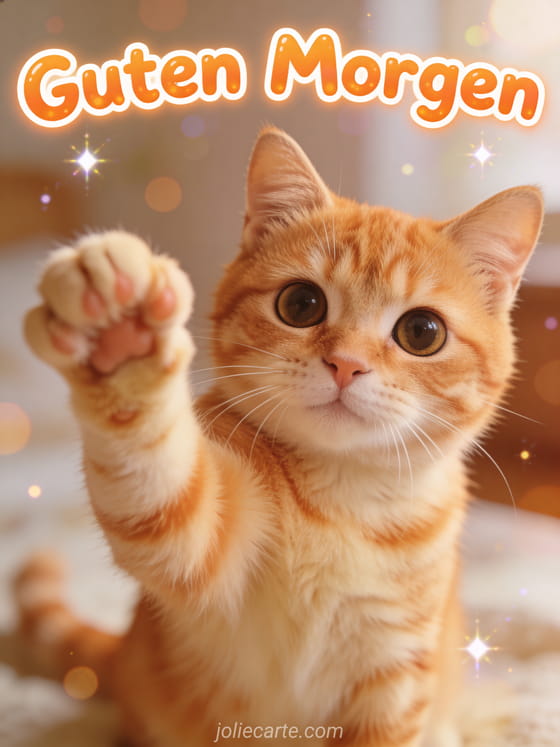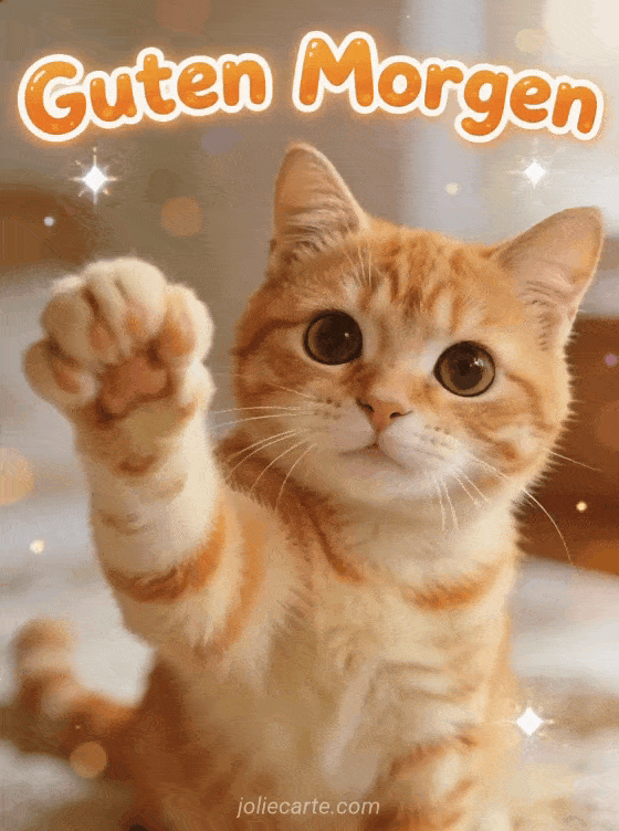 Senden Sie einen niedlichen guten Morgen mit einer entzückenden winkenden Katze, um den Tag zu verschönern. Entdecken Sie auch ein lustiges guten Morgen Humor-Bild, eine berührende Morgenbotschaft oder einen zärtlichen Morgengruß.