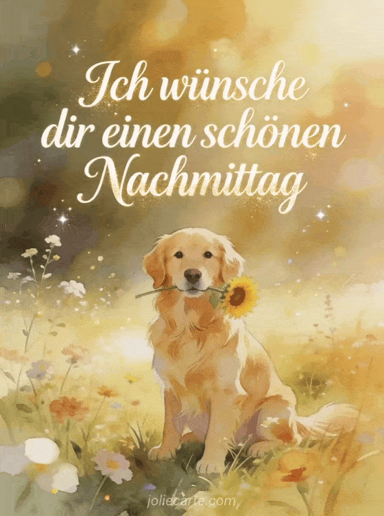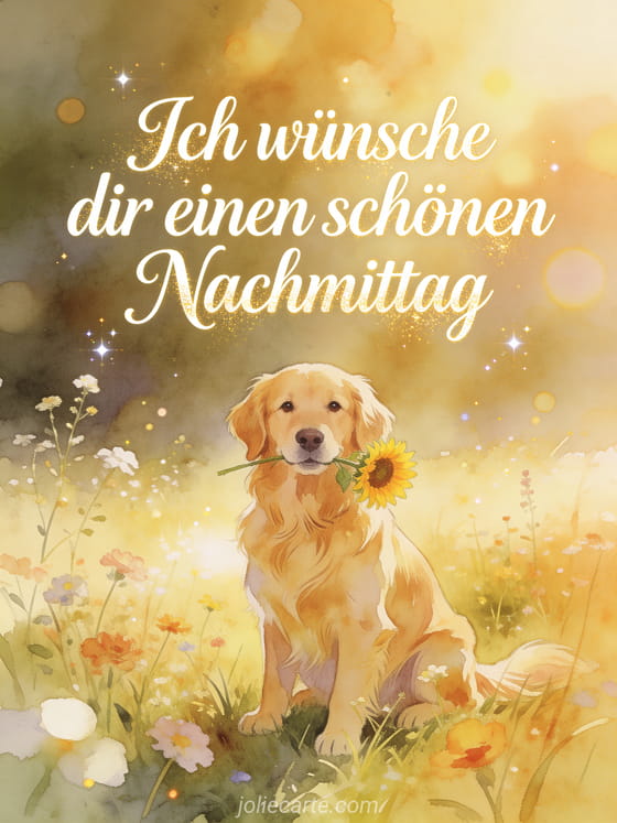 Sende einen wunderschönen Nachmittagsgruß, um jemandem den Tag zu verschönern. Ein bezaubernder Golden Retriever sitzt auf einer sonnigen Wiese mit Wildblumen und hält eine Sonnenblume im Maul in dieser herzerwärmenden Aquarell-Illustration.