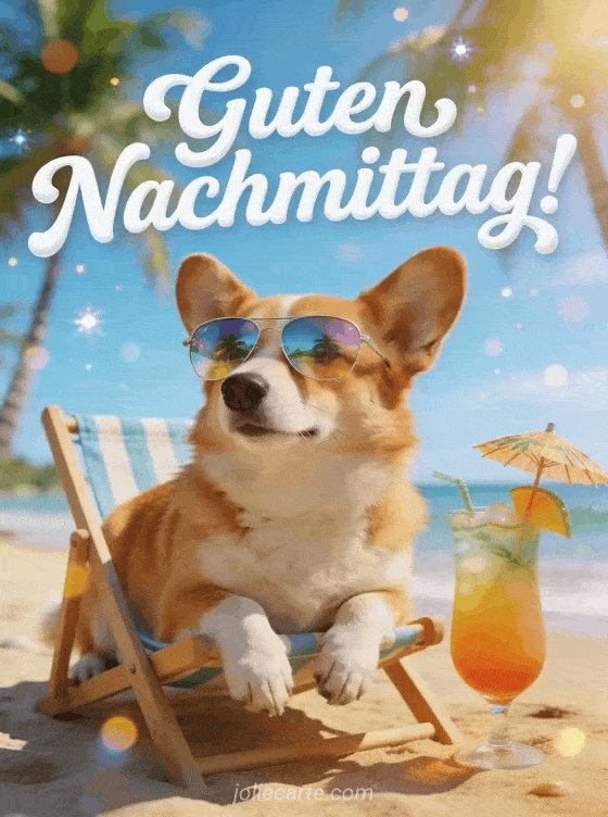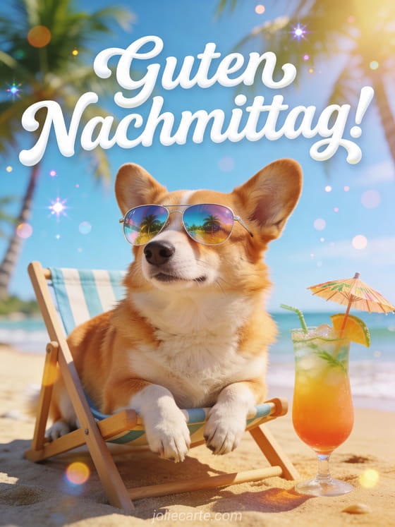 Verschönere jemandem den Nachmittag mit dieser witzigen Grußkarte. Ein lustiger Corgi-Hund mit übergroßer Sonnenbrille relaxt auf einem kleinen Strandstuhl mit einem tropischen Cocktail. Entdecke auch eine Karte für einen sonnigen Nachmittag oder eine Guten-Nachmittag-Karte.