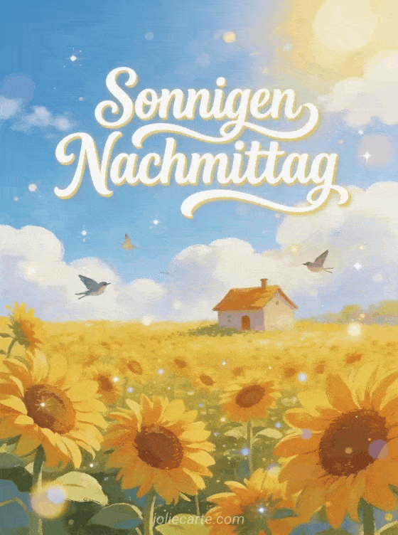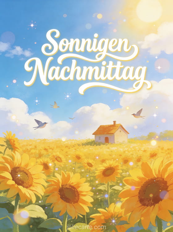Verschönere jemandem den Tag mit dieser GruĂkarte fĂŒr einen sonnigen Nachmittag. Eine fröhliche Illustration eines Sonnenblumenfeldes mit einem kleinen HĂ€uschen, strahlend blauem Himmel mit flauschigen Wolken und fliegenden Vögeln. Entdecke auch eine Guten-Nachmittag-Karte.