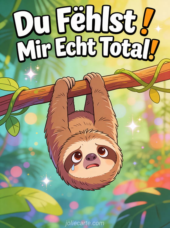 Senden Sie diese lustige Grußkarte mit einem süßen Faultier, das kopfüber an einem Ast hängt mit dramatisch traurigem Gesicht im bunten Dschungel. Entdecken Sie auch eine Karte du fehlst mir so sehr mein Schatz oder eine Karte ich denke an dich du fehlst mir.
