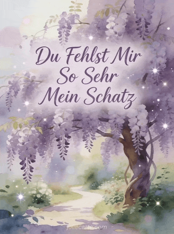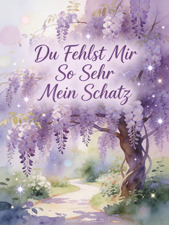 Senden Sie diese romantische GruĂkarte mit einem wunderschönen Glyzinienbaum in voller BlĂŒte mit herabfallenden lila BlĂŒten entlang eines Gartenwegs. Entdecken Sie auch eine Karte ich denke an dich du fehlst mir oder eine Karte ich liebe dich du fehlst mir.