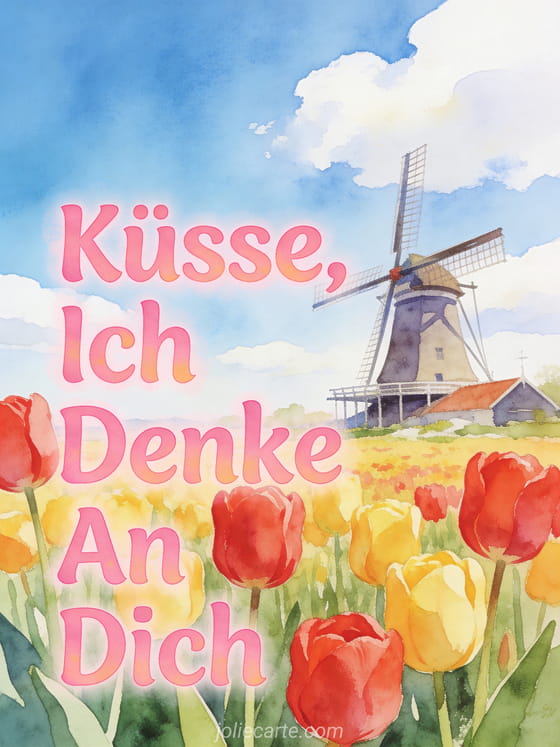 Senden Sie diese fröhliche Grußkarte mit bunten roten und gelben Tulpen auf einem Frühlingsfeld mit einer holländischen Windmühle. Entdecken Sie auch eine Karte ich denke an dich meine Liebe oder eine Karte ich denke an dich mein Schatz.