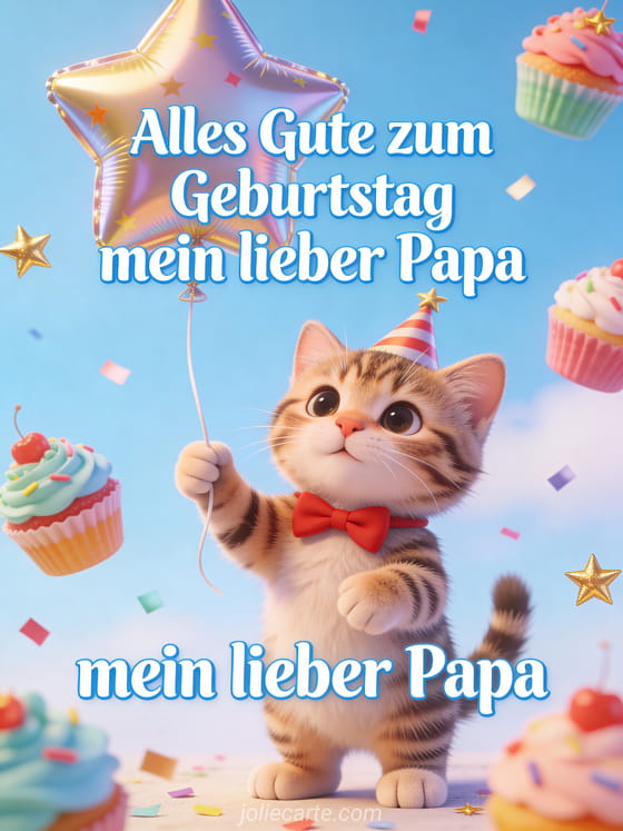 Feiere Papas Geburtstag mit dieser entzückenden kostenlosen Karte. Ein süßes Tigerkätzchen mit Partyhut und roter Fliege hält einen Sternballon, bunte Cupcakes und goldenes Konfetti. Entdecke auch eine Geburtstagskarte Papa mit Herzen oder eine Geburtstagskarte Papa mit Text oder eine Geburtstagskarte Papa mit Zeichnung.