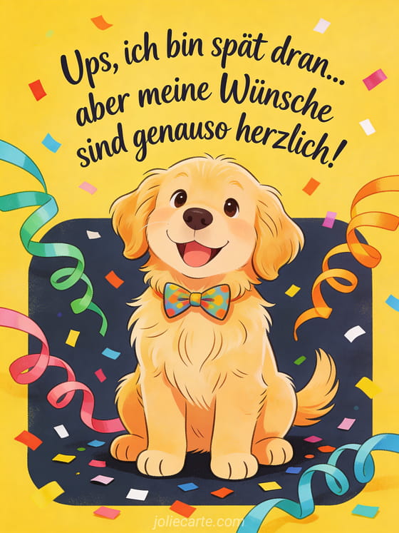 Entschuldigen Sie die Verspätung mit dieser charmanten und humorvollen Geburtstagskarte. Ein süßer Golden Retriever mit Fliege sendet herzliche Glückwünsche. Entdecken Sie auch eine nachträgliche Geburtstagskarte oder eine verspätete Geburtstagskarte.
