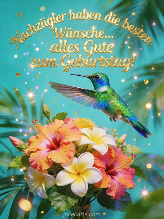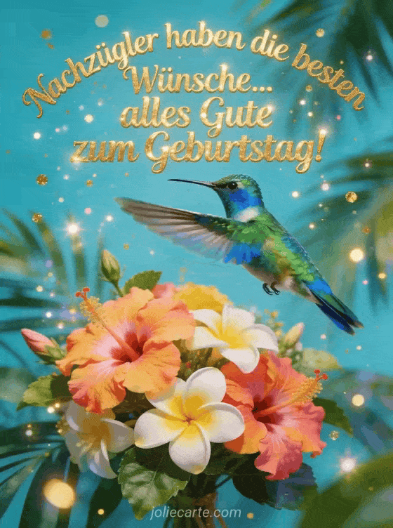 Senden Sie diesen bunten verspäteten Geburtstagsgruß mit einem schönen Kolibri und tropischen Blumen, um den Tag zu verschönern. Entdecken Sie auch einen lustigen verspäteten Geburtstagsgruß oder eine verspätete Geburtstags-SMS oder ein verspätetes Geburtstags-GIF.