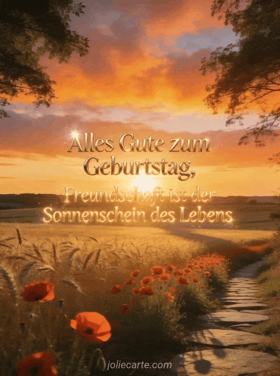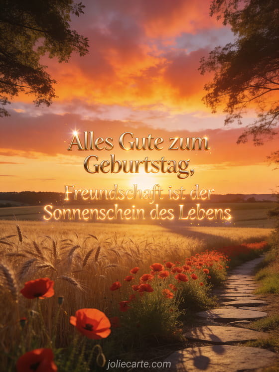 Feiern Sie den Geburtstag einer Freundin mit dieser herzlichen Karte mit goldenen leuchtenden Buchstaben, einem flammenden Sonnenuntergang über einem goldenen Weizenfeld mit roten Mohnblumen am Wegrand, in einer ruhigen Sommeratmosphäre. Entdecken Sie auch eine Freundschafts-Geburtstagskarte mit Sternen oder eine Geburtstagskarte für Freundin.