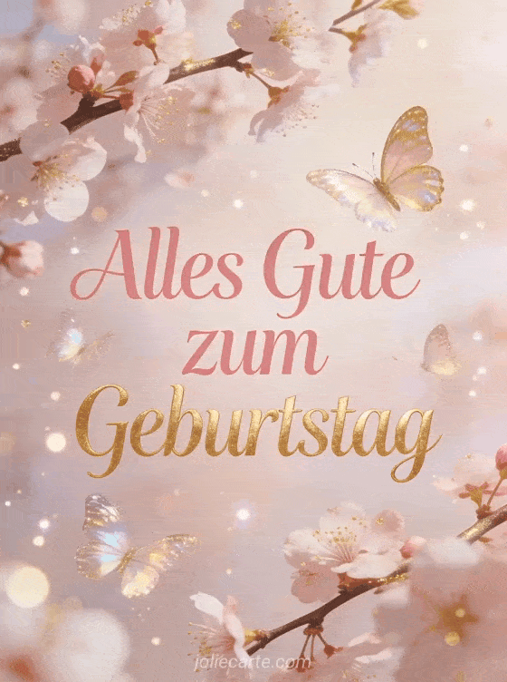 Senden Sie einen raffinierten und zarten Geburtstagsgruß mit schillernden Schmetterlingen und Kirschblüten. Entdecken Sie auch eine Geburtstagskarte Blumenstrauß für Frauen, eine Geburtstags-ecard für Frauen oder ein kostenloses Geburtstags-Gif für Frauen.