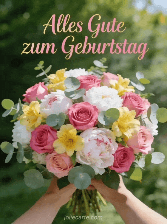 Senden Sie einen fröhlichen Geburtstagsgruß mit einem prächtigen Strauß aus Rosen und Pfingstrosen, um ihren Tag zu erhellen. Entdecken Sie auch eine Geburtstags-ecard für Frauen, ein kostenloses Geburtstags-Gif für Frauen oder ein lustiges Geburtstags-Gif für Frauen.