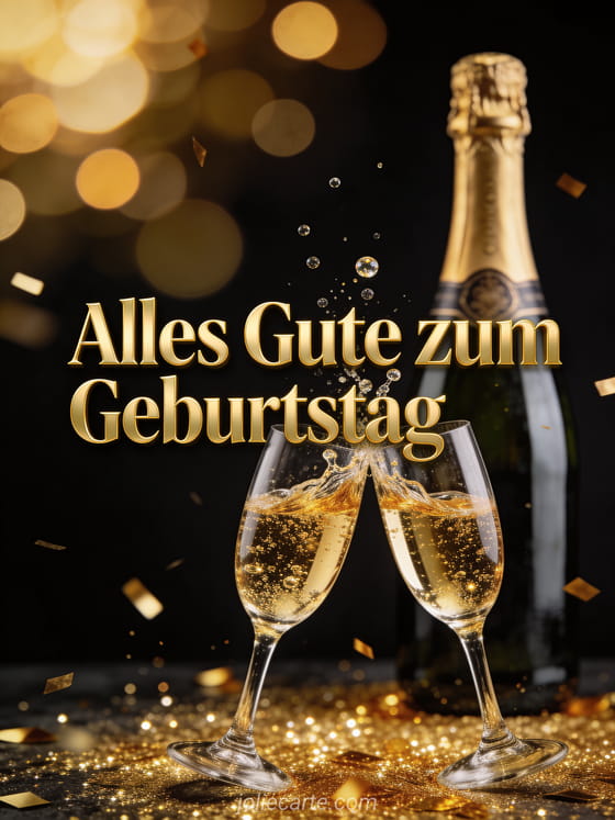 Verschicken Sie diese elegante Geburtstagskarte fuer Maenner mit goldenen Buchstaben und aufsteigenden Champagnerblasen, zwei Kristall-Champagnerglaesern die mit goldenen Spritzern anstossen, einer Vintage-Flasche im Hintergrund und goldenem Konfetti. Entdecken Sie auch eine animierte Geburtstagskarte fuer Maenner oder eine Geburtstagskarte fuer Maenner.
