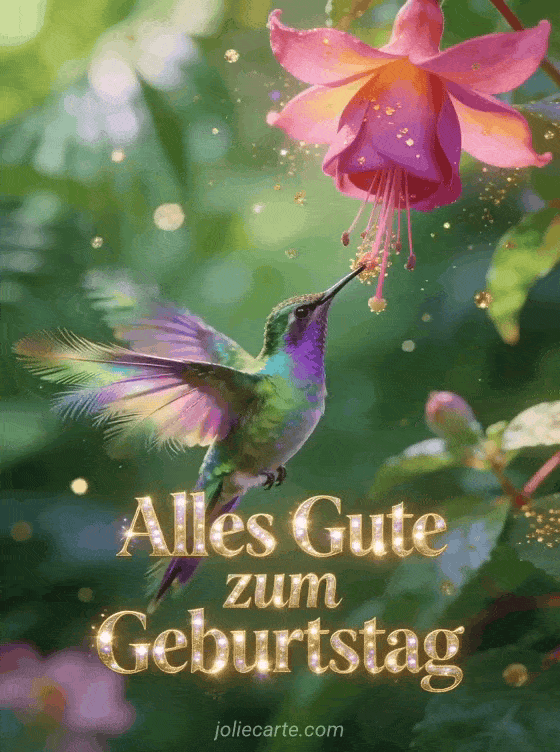 Senden Sie einen zarten und leuchtenden Geburtstagsgruß mit einem wunderschönen Kolibri, um ihren Tag besonders zu machen. Entdecken Sie auch ein kostenloses Geburtstags-Gif für Frauen, ein lustiges Geburtstags-Gif für Frauen oder ein animiertes Geburtstags-Gif für Frauen.
