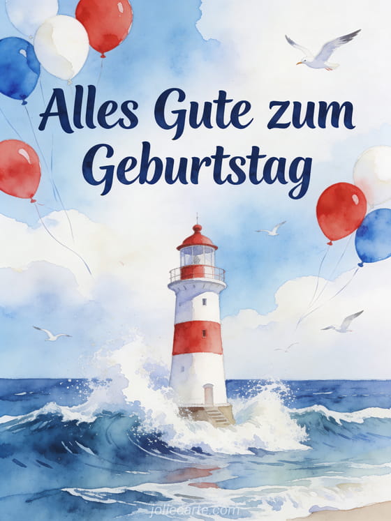 Verschicken Sie diese charmante Geburtstagskarte fuer Maenner mit einer Aquarell-Illustration eines weiss-roten Leuchtturms am Meer mit brechenden Wellen, bunten rot-blau-weissen Luftballons im Wind und Moewen am frischen blauen Himmel. Entdecken Sie auch eine Geburtstagskarte fuer Maenner oder eine lustige Geburtstagskarte fuer Maenner.